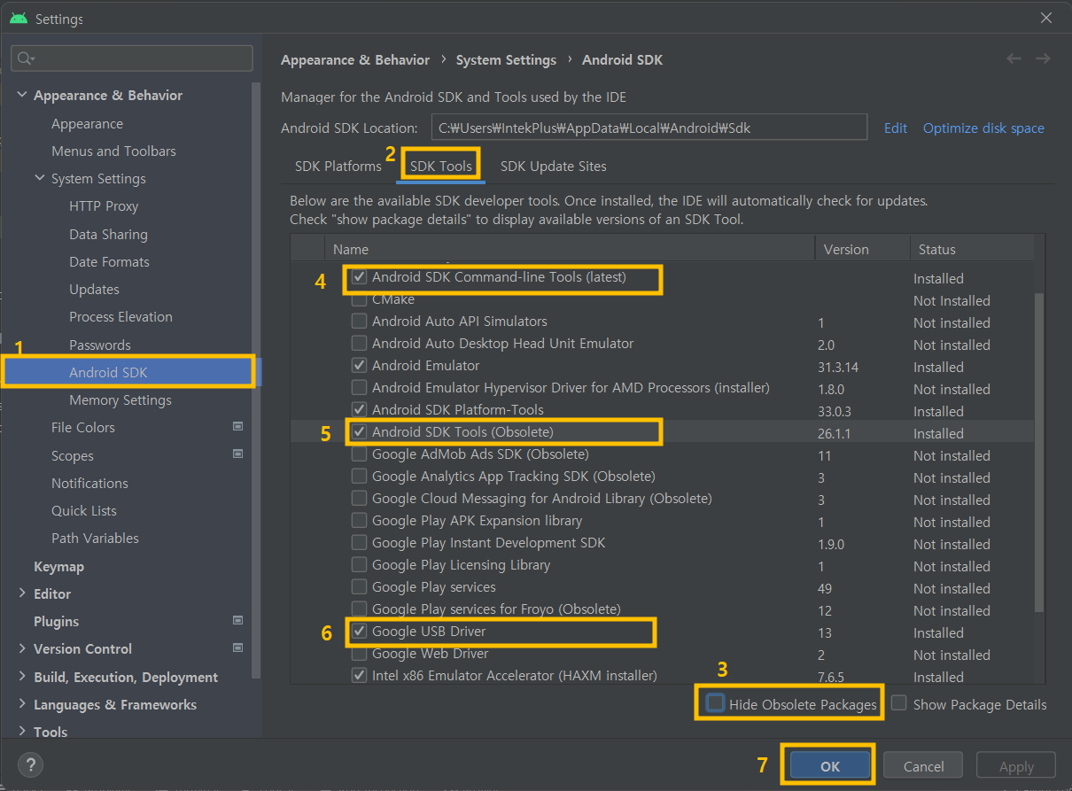 Android SDK - SDK Tools - Hide Obsolate Packages 체크 해제