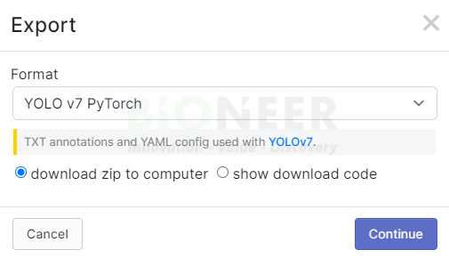 roboflow에서 데이터를 내보낼때 YOLOV7 PyTorch 형식으로 Export 한다.