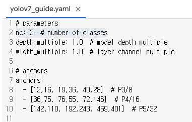 yolov7.yaml 원본 파일은 그대로 놔두고 yolov7.yaml 복사한뒤 yolov7_guide.yaml 로 이름을 변경해준다