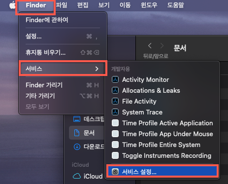 1. Finder - 서비스 -서비스 설정탭