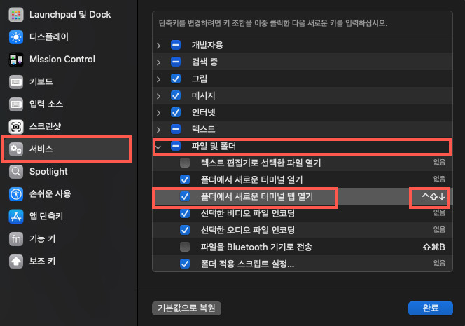 2. 서비스 - 파일 및 폴더 - 폴더에서 새로운 터미널 탭 열기