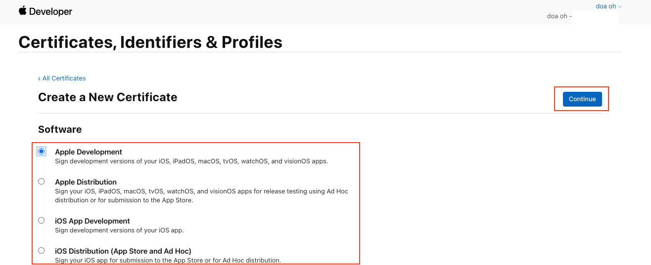 2. 애플 개발자 포털에서 인증서 발급: