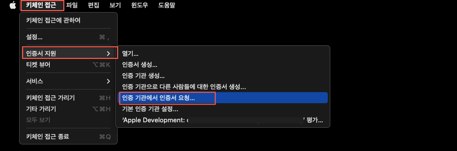 키체인 접근 - 인증서지원- 인증기관에서 인증서요청 탭을 순서대로 선택합니다
