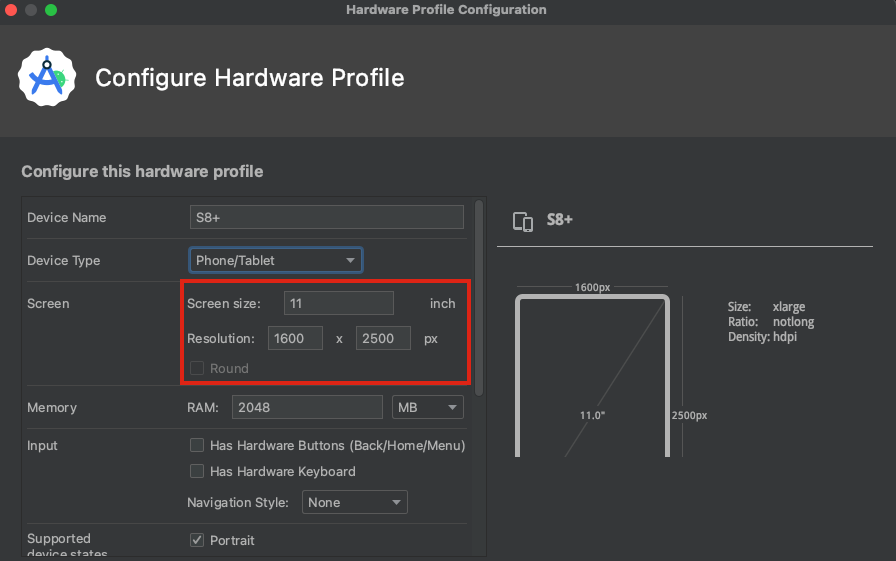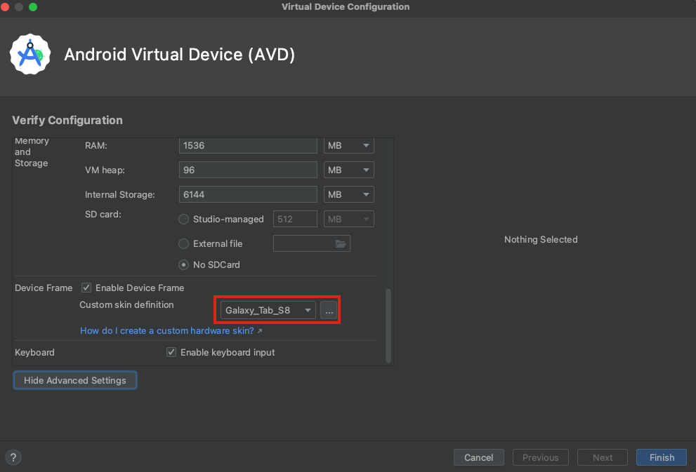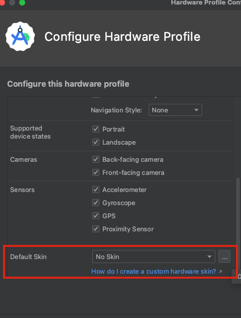 6. 디바이스 이름과 해상도를 설정해주고 , Default skin 에 아까 다운받은 폴더 경로를 넣어준다