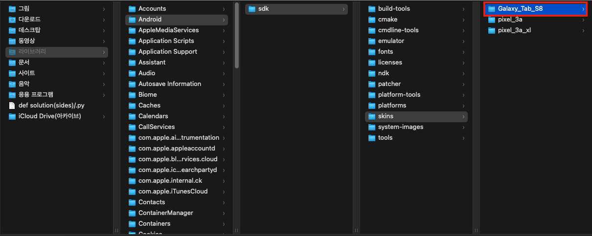 맥 기준 경로 : /Users/user-name/Library/Android/sdk/skins