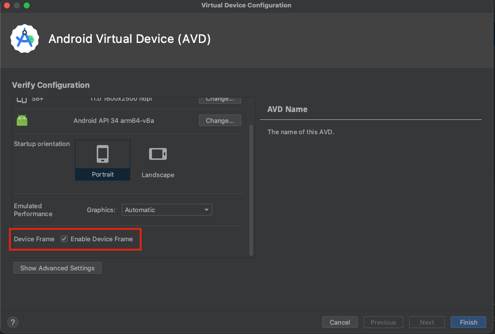 10. 디바이스 프레임이 체크 되어잇는지 확인한다. 만약 체크가 되어있지 않다면 - Show Advanced Setting